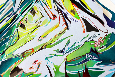 These artworks combine drawing and sculpture, each pieces has cut-out and layered shapes that add depth and dimension. Created with various papers and art materials, mainly colored pencil and paint, the artworks begin as small sketches inspired by nature that are then transformed into multi-layered compositions.